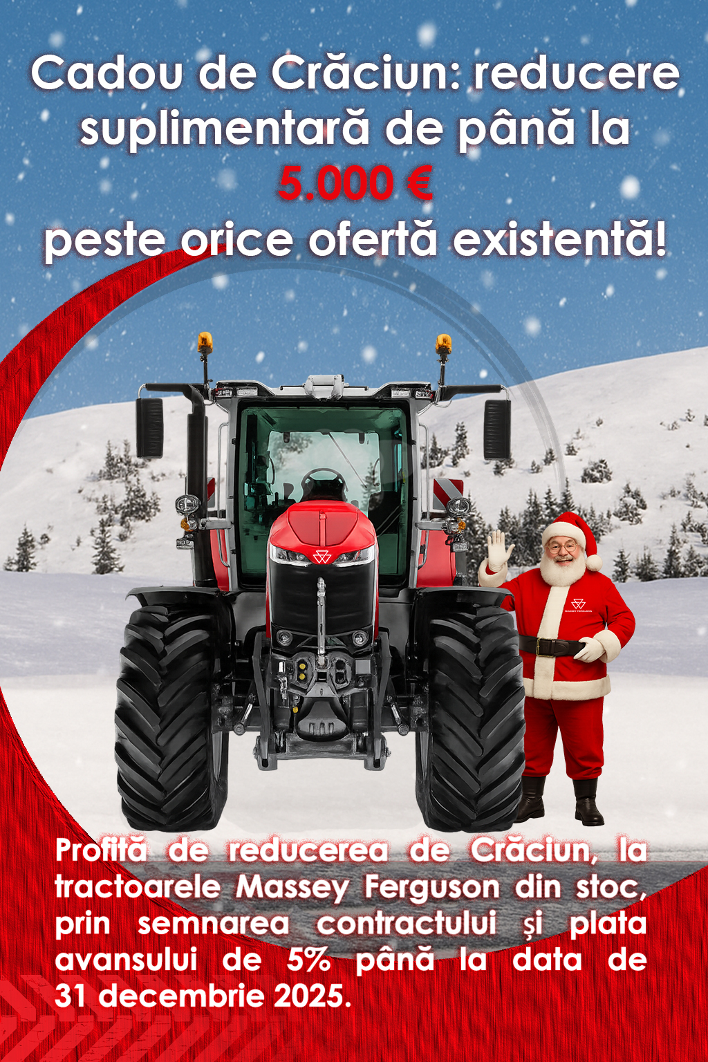 Dacă vrei să începi anul cu un tractor nou, acum ai până la 5.000 € reducere suplimentară (functie de model), valabilă pentru toată gama de tractoare Massey Ferguson din stoc.